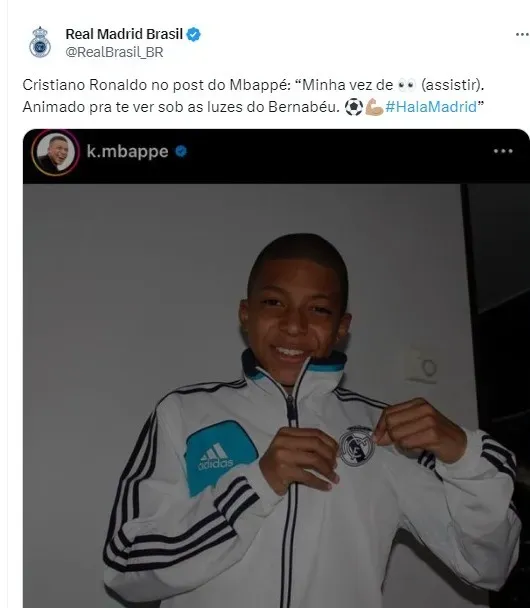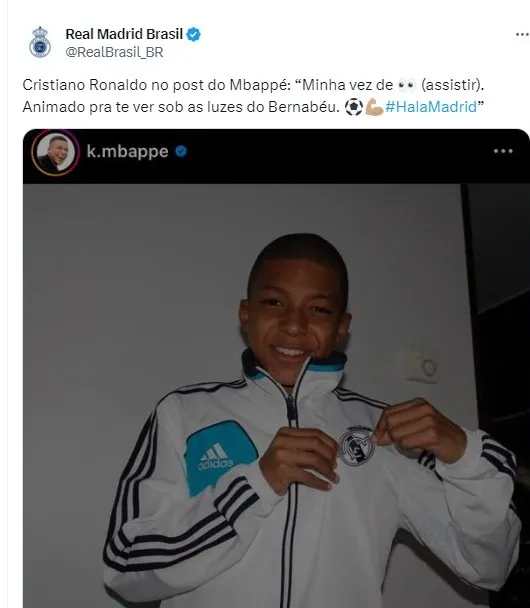 Uma das fotos da publicação é Kylian na adolescência ao lado de Cristiano Ronaldo brincando com ele. Vale lembrar que o jogador francês disse em várias oportunidades que era torcedor do Real Madrid e um dos seus ídolos é Cristiano Ronaldo.