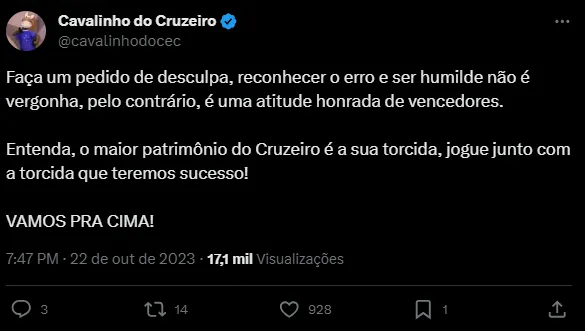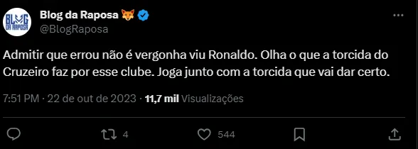 “Faça um pedido de desculpa, reconhecer o erro e ser humilde não é vergonha, pelo contrário, é uma atitude honrada de vencedores. Entenda, o maior patrimônio do Cruzeiro é a sua torcida, jogue junto com a torcida que teremos sucesso!”, “Admitir que errou não é vergonha viu Ronaldo. Olha o que a torcida do Cruzeiro faz por esse clube. Joga junto com a torcida que vai dar certo” e “Você deve no mínimo um pedido de desculpas. A mesma torcida que carregou você no colo em 2022, é a mesma faz cobranças em 2023. Time GIGANTE é movido a paixão e pressão. O Cruzeiro nasceu pra vencer, espero que saiba!”, foram alguns dos comentários.