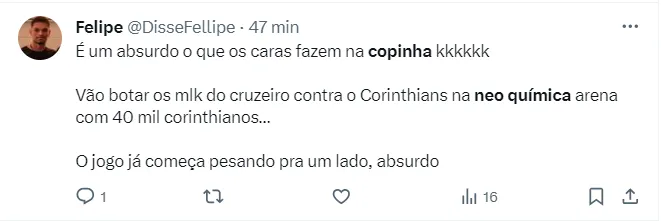 Segundo o entendimento dos cruzeirenses, já é de ciência que o Corinthians jogando em seus domínios e com sua torcida, transforma totalmente a atmosfera do jogo, o que seria uma ‘leve vantagem’ diante dos garotos do Cruzeiro.