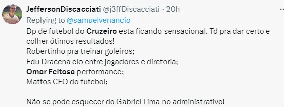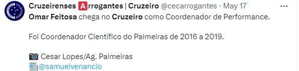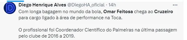 O Cruzeiro vem passando por alterações no departamento de futebol. Essas mudanças ocorrem depois da SAF do clube mineiro ter sido revendida para Pedro Lourenço. A novidade é Omar Feitosa para a função de coordenador de performance da toca da Raposa 2.