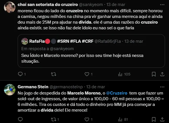 Nesta semana, o Cruzeiro anunciou o retorno do atacante Marcelo Moreno, de 36 anos, ídolo da torcida cruzeirense, para a realização de um jogo de despedida para a aposentadoria do boliviano.