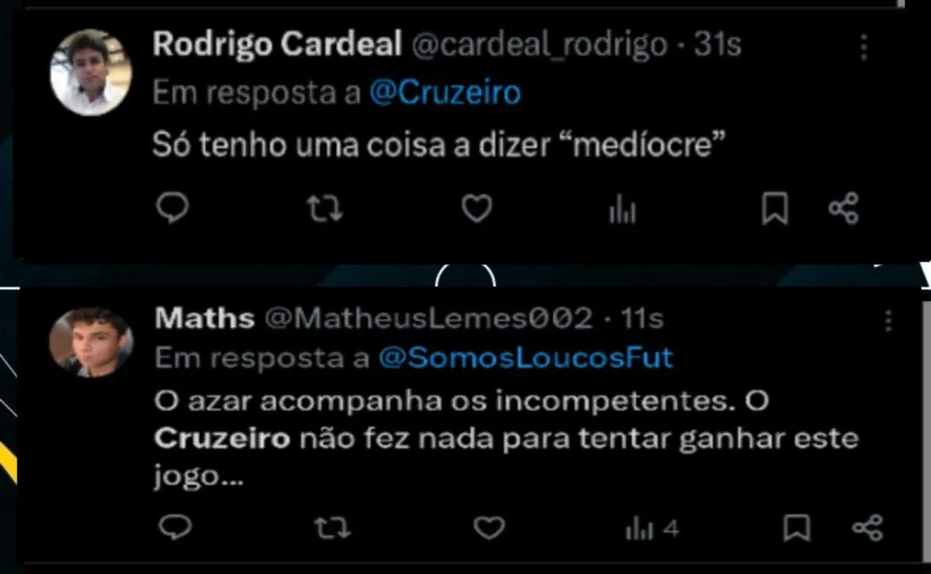 “Jogo mt ruim do Cruzeiro. Seabra novamente aceitando d+ as circunstâncias do jogo sem um mínimo de variação tática. Substituições sempre as mesmas, acreditando excessivamente em um esquema q me parece já estudado pelos adversários.”