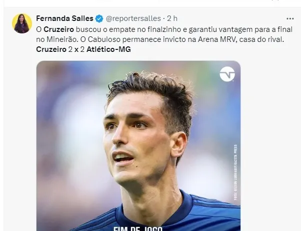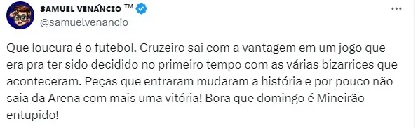 “Que loucura é o futebol. Cruzeiro sai com a vantagem em um jogo que era pra ter sido decidido no primeiro tempo com as várias bizarrices que aconteceram. Peças que entraram mudaram a história e por pouco não saíram da Arena com mais uma vitória! Bora que domingo é Mineirão entupido!” disse Samuel Venâncio.