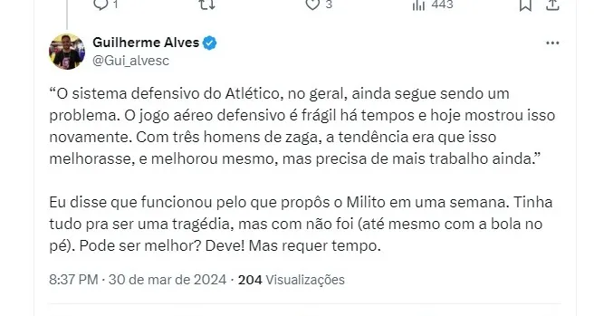 “O sistema defensivo do Atlético, no geral, ainda segue sendo um problema. O jogo aéreo defensivo é frágil há tempos e hoje mostrou isso novamente. Com três homens de zaga, a tendência era que isso melhorasse, e melhorou mesmo, mas precisa de mais trabalho ainda.”