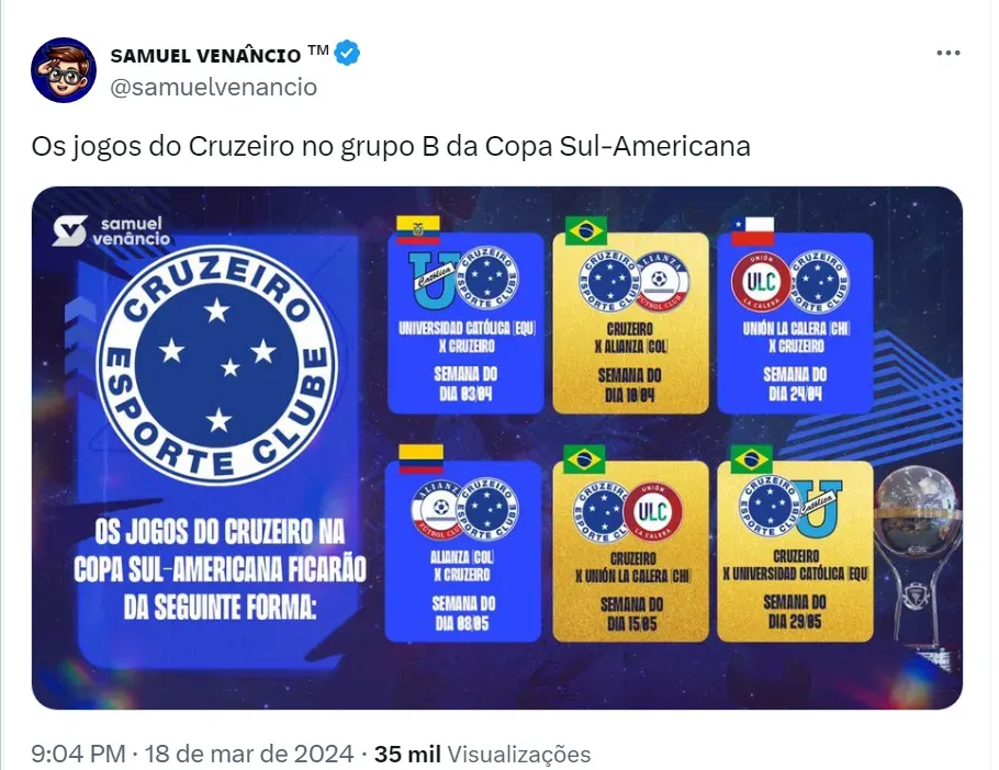 Na fase de grupos da Copa Sul-Americana, o Cruzeiro foi sorteado para o Grupo B e vai enfrentar Unión La Calera, do Chile, Universidad Católica, do Equador, e Alianza Petrolera, da Colômbia.