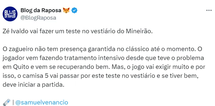 Porém, ao mesmo tempo, o comandante tem um problema. Zé Ivaldo pode ser desfalque após sentir dores na coxa esquerda durante a estreia da Raposa na Copa Sul-Americana.