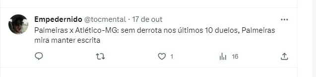 O Atlético-MG tem duelo contra o Palmeiras, pela 27ª rodada do Campeonato Brasileiro, nesta próxima quinta-feira (19). O Galo vai até São Paulo enfrentar o Verdão no Allianz Parque, às 19h (horário de Brasília). O confronto marca a disputa de duas equipes que brigam por uma vaga para a próxima libertadores. Já que a conquista pelo Brasileirão, fica cada vez mais distante.