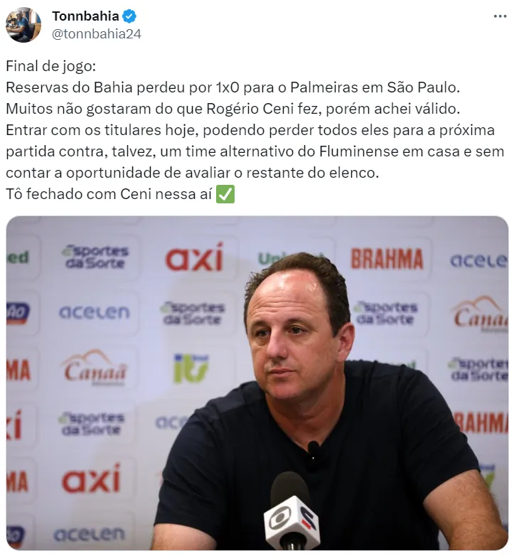 Em entrevista coletiva, o técnico Rogério Ceni falou sobre a partida e o desempenho da equipe. Para o comandante, o Bahia tinha condições de pontuar, o que não aconteceu por consequência de pequenos erros.