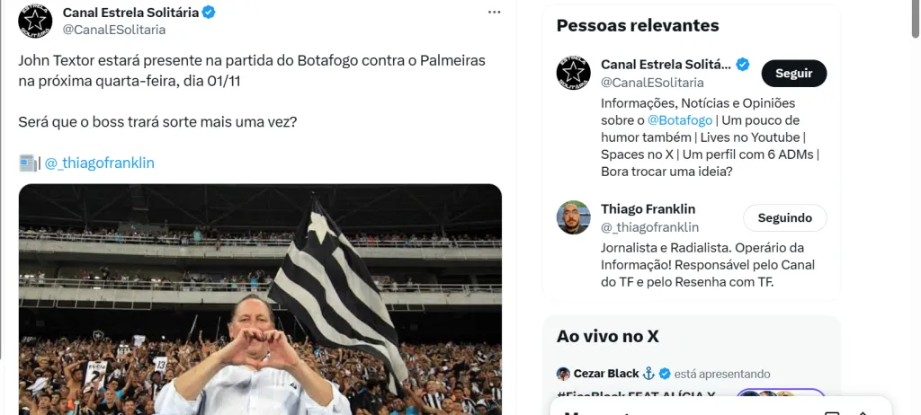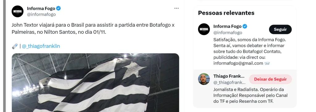 Com informações do setorista Thiago Franklin, que cobre o dia a dia em General Severiano, Textor é esperado no Rio de Janeiro para acompanhar o jogo contra o Palmeiras, no Nílton Santos. O duelo está programado para a próxima quarta (1). Três dias antes, no mesmo palco, o time comandado por Lúcio Flávio recebe o Cuiabá.