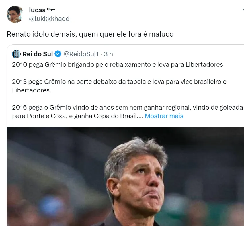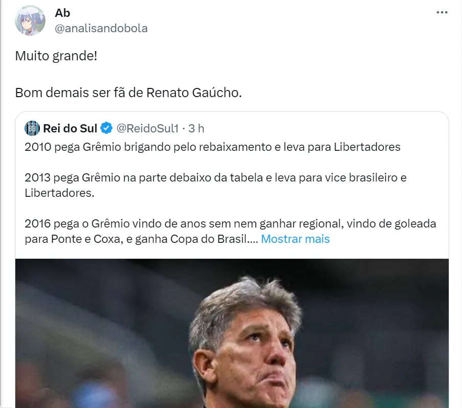 “Em todos os anos que treinou o clube, levou para Libertadores. Volta ao clube desmontado por uma gestão em 2022, completa o acesso e remonta a equipe. E de novo brigando por vaga na Libertadores. Sem mencionar hegemonia em estaduais e grenais no período, que são coisas menores, mas melhor do que não ganhar, mas menores”, disse o perfil Rei do Sul, voltado para o torcedor do Grêmio.