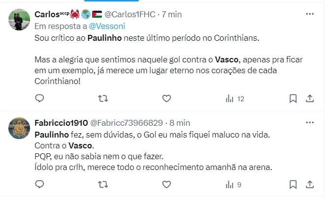 “É o gol mais importante. É o gol que eu vou olhar o resto da minha vida. Então, o mínimo uma vez na semana eu olho esse gol porque, cara, é uma coisa surreal, como eu falei, de ser um privilegiado, e de estar num momento como aquele importante e marcante para o torcedor corintiano. Então, sem sombra de dúvidas, o gol contra o Vasco”, disse.