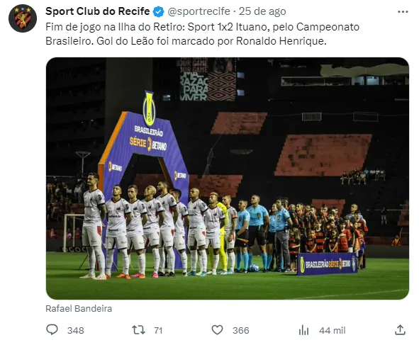 O Sport entrou em campo nesta sexta-feira (25) contra o Ituano. Mesmo dentro de casa, com a sua torcida, o Clube não conseguiu e acabou sofrendo um revés para o seu adversário por 2 a 1. Com isso, o time deixou de pontuar e se conseguir assumir a liderança.