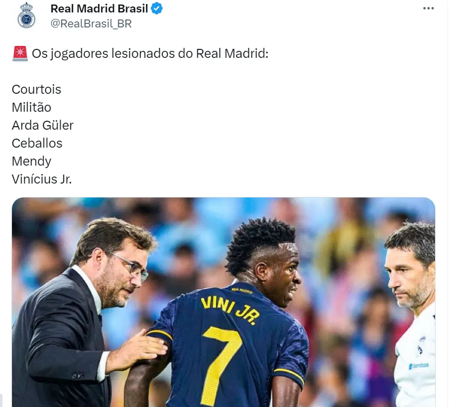 “Depois dos exames realizados em nosso jogador Vinícius Júnior pelos serviços médicos do Real Madrid, foi diagnosticada uma lesão no músculo bíceps femoral direito. Pendente de evolução”, disse o comunicado do Real Madrid. Com isso, é mais um jogador importante se machucando nos merengues – Courtois e Militão também se lesionaram recentemente.