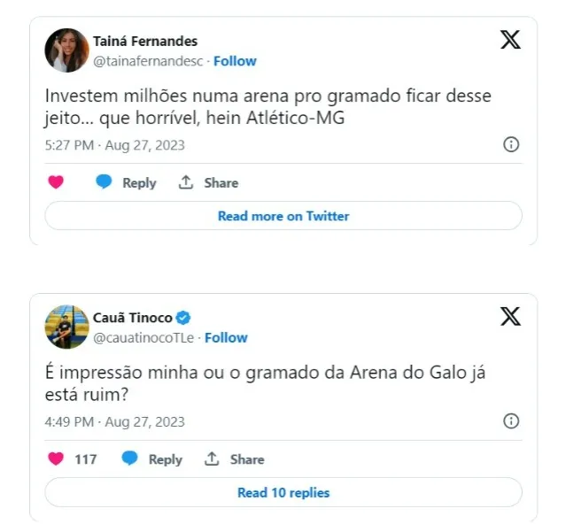 Ainda na segunda etapa, uma placa de grama chegou a soltar no local e a manutenção do estádio teve de entrar em ação para conseguir recolocar no lugar. O jogo precisou ser paralisado para que o gramado fosse arrumado. Com os problemas, choveram críticas à arena nas redes sociais. Com vários torcedores comentando sobre as falhas da Arena.