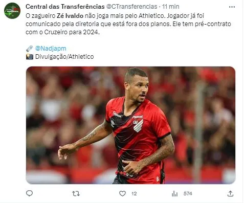Trata-se do zagueiro Zé Ivaldo, que foi comunicado de seu afastamento. O defensor tem vínculo com o Athletico até o final do ano, porém, já firmou um pré-contrato com o Cruzeiro, e assinou por três temporadas com o Clube mineiro. A informação é da jornalista Nadja Mauad, do Globo Esporte.