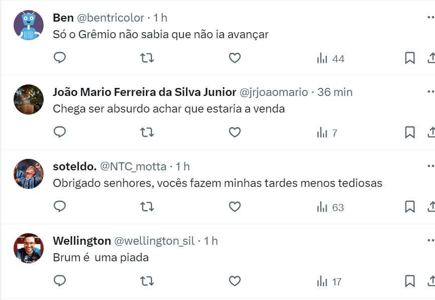 O Botafogo já vinha comunicado que o atacante de 33 anos não está à venda e, com isso, o Grêmio tratou de sair do negócio. Tiquinho Soares tem contrato com o Glorioso até o fim de 2024 e vai seguir no time carioca.
