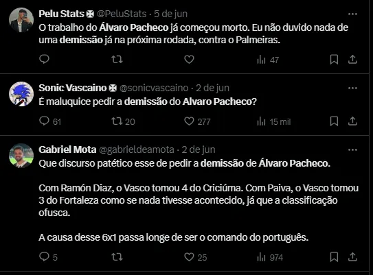 Porém, ele já estaria sob análise da cúpula vascaína. Dessa forma, as próximas rodadas do Brasileirão poderiam ser essenciais para qualquer mudança de postura a respeito de seu trabalho frente ao Gigante da Colina.