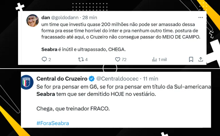 Só que, pelo que parece nas redes sociais, torcedores da Raposa não perdoam mais as atuações pífias do Cruzeiro fora de casa no Brasileirão Série A. Seabra já é um dos termos mais comentados no X, e a maioria pede sua demissão.