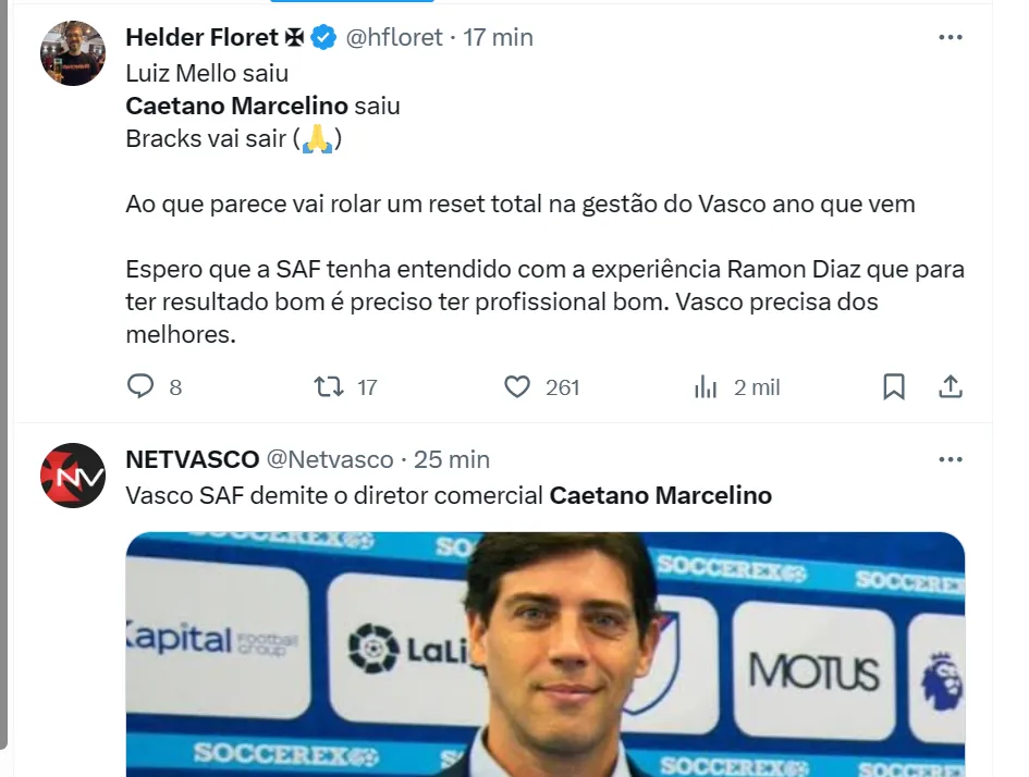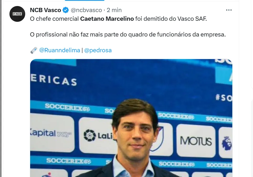 Há pouco, os setoristas Ruann de Lima e Lucas Pedrosa confirmaram a informação de que a SAF, de Josh Wander, demitiu Caetano Marcelino, chefe comercial do Vasco.