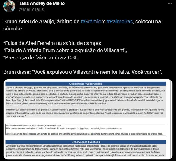 “Informo que após o término da partida, quando deixei o gramado, fui abordado pelo vice-presidente do Grêmio, sr. Antônio Brum, que de forma ríspida, intimidatória, com dedo em riste e esbravejando, proferiu as seguintes palavras: Você expulsou o Villasanti e nem foi falta! Você vai ver! Você vai ver!. Antes da partida, foi identificada uma faixa branca localizada na torcida organizada (geral) do grêmio, atrás da meta localizada do lado esquerdo das cabines de transmissão, com os seguintes dizeres: “cbf lixo, vargonha”. solicitamos ao delegado da partida para que fosse providenciada a retirada da faixa antes do início da partida”, relatou Arleu na súmula.
