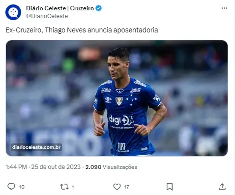 O meio-campista Thiago Neves resolveu se aposentar nesta quarta-feira (25) aos 38 anos de idade. Após 16 anos de dedicação ao futebol profissional, o atleta admitiu em entrevista exclusiva à ESPN Brasil que chegou o momento de pendurar as chuteiras por uma decisão que passa desde novas ambições para uma nova carreira até questões delicadas no âmbito familiar. Com passagens por Paraná, Fluminense, Flamengo, Grêmio, equipes de Alemanha e Arábia Saudita, o agora ex-jogador mexeu também com a torcida do Cruzeiro.