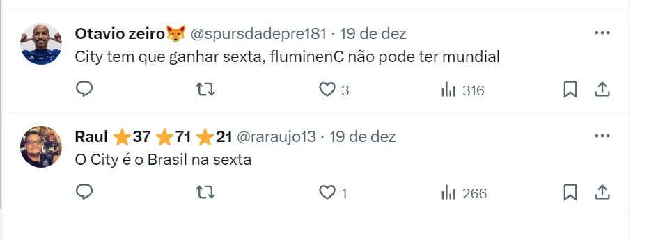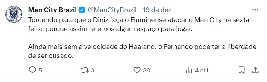 Campeão da Champions League, os Citizens jogam o torneio da Fifa pela primeira vez. A final vai ser na sexta-feira (22), às 15h (de Brasília), contra o Fluminense, que bateu na semifinal o Al Ahly, do Egito.