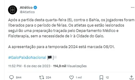 Neste cenário, com a vaga direta para a Libertadores, o Galo passa a ter o seu calendário mais definido no primeiro semestre do próximo ano. Os jogos do torneio começam em abril para a fase de grupos.