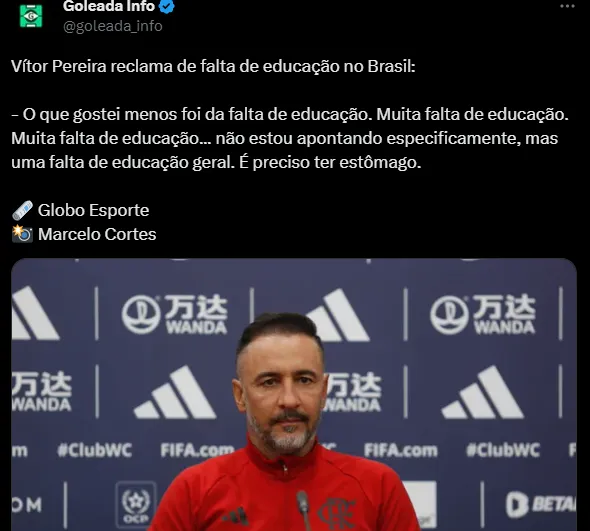 “O que gostei menos foi da falta de educação. Muita falta de educação. Muita falta de educação… não estou apontando especificamente, mas uma falta de educação geral. É preciso ter estômago. Não é da imprensa especificamente, é do futebol em si. Tudo que envolve o futebol. Passa um pouco do limite, a emoção passa um pouco do limite, e dizem as coisas que nós, aqui, ainda não estamos preparados. Lá pode ser normal. Já percebi que é um pouco cultural. Para nós, é um pouco difícil. Não posso me arrepender sem ir. Tenho que ir e ver”, desabafou Vítor Pereira.