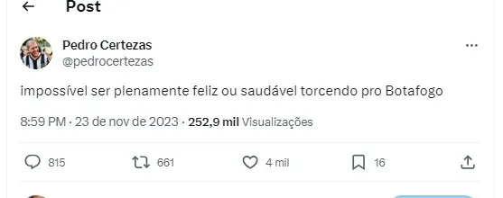 “Mas a motivação é grande. E digo que a confiança não mudou. Desde que eu cheguei no clube o discurso é sempre. Vamos ser campeões. O mental do jogador está blindado, está protegido. O Botafogo já deu certo, independente do desfecho final. Está fazendo uma temporada de excelência e não podemos descaracterizar esse recorte de competição”, finalizou.
