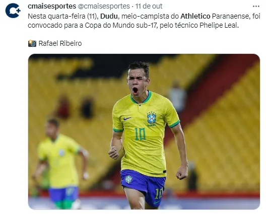 Com todo este cenário, os torcedores Rubro-Negros ganharam mais um motivo para se orgulhar de Dudu. O jogador foi convocado para o Mundial Sub-17, competição que será disputada na Indonésia entre os dias 3 de novembro e 2 de dezembro.Ele será o único representante do futebol paranaense no torneio.