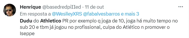Ciente do potencial que tem em mãos, os torcedores do Athletico foram até as redes pedir uma maior utilização do meia na equipe profissional. O time de Wesley Carvalho atualmente, conta com 3 a 4 jogadores que atuam na posição de Dudu, com destaque para o meia Vitor Bueno. Veja um dos comentários abaixo.
