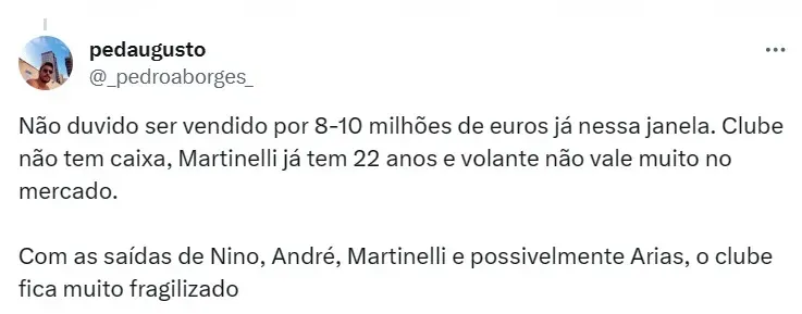 Segundo o site Transfermarkt, especializado em transferências, o valor de mercado de Martinelli é de 7 milhões de euros (cerca de R$ 37 milhões na cotação atual). É provável que o Flu peça ainda mais.