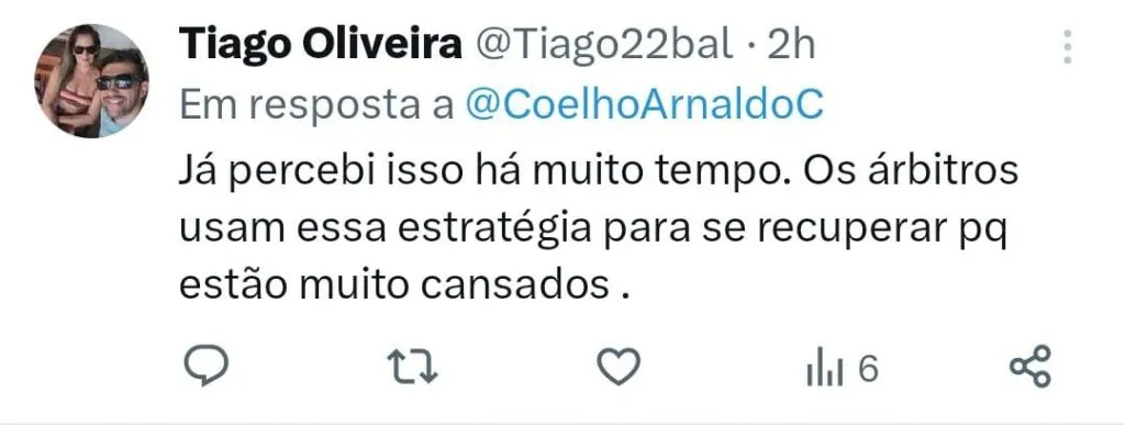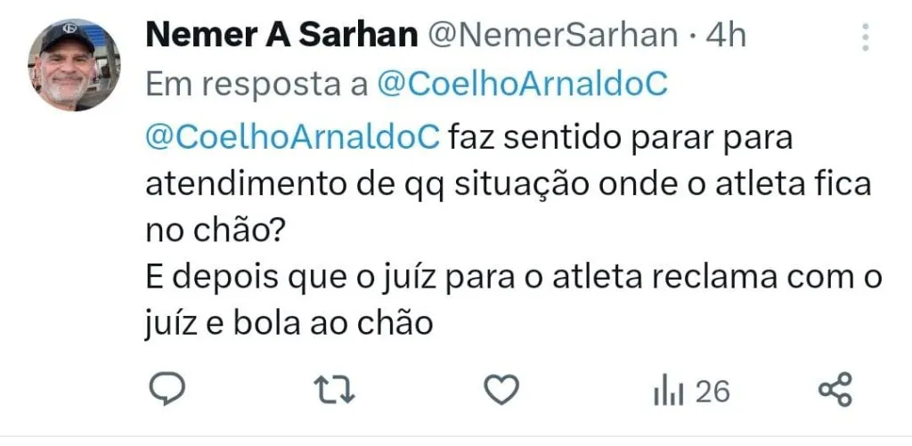 Na visão de Arnaldo Cezar Coelho, esse tipo de conduta atrapalha a dinâmica da partida. O comentarista ainda questionou um possível cansaço dos árbitros devido ao calendário agitado. “Vocês notaram o número de ‘bolas ao chão’ nos jogos do Brasileiro? Determinados árbitros exageram em param o jogo por qualquer motivo, o jogo perde a dinâmica, a bola para de rolar. Será que estão cansados por tantos jogos e viagens? Espertos!”, escreveu em seu perfil no Twitter.