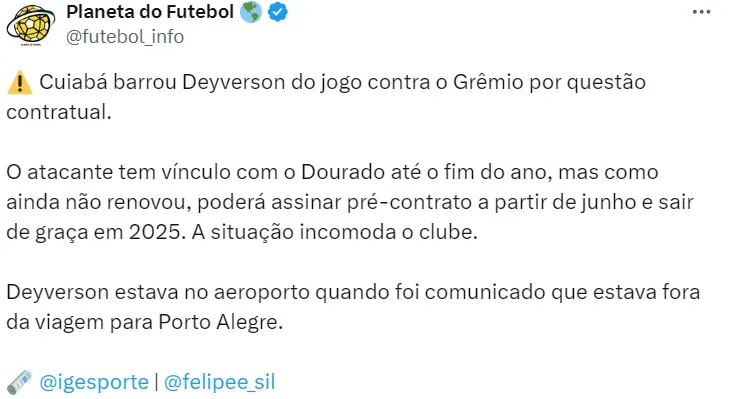 Nesta sexta-feira (19), o Cuiabá informou que o atacante Deyverson foi cortado do jogo contra o Grêmio. Os times se enfrentam no sábado (20), pela terceira rodada do Brasileirão.