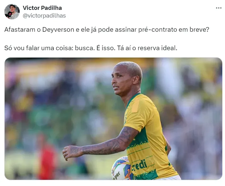 “Nesse momento precisamos de jogadores comprometidos com o clube, independente de estarem participando ou não efetivamente dos jogos”, informou a nota, afirmando que Deyverson seguirá os treinos com os não relacionados.