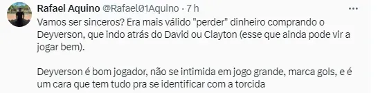 Vale ressaltar que de acordo com o site Transfermarkt, Deyverson está avaliado hoje no valor de 1 milhão de euros (R$ 5,4 milhões, conforme a cotação atual) e tem um salário na casa dos R$ 300 mil. Porém, ele teria uma multa na casa do R$ 20 milhões.