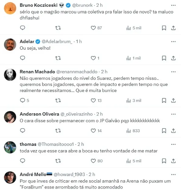 “A gente sabe da expectativa da torcida e quer corresponder. A gente pensa grande, se a gente vai conseguir concretizar ou não eu não posso te afirmar. Dificilmente um nome como Suárez vai existir. Mas a gente pensa num jogador importante, de alguma liga grande, e que tenha uma carreira grande”, finalizou.