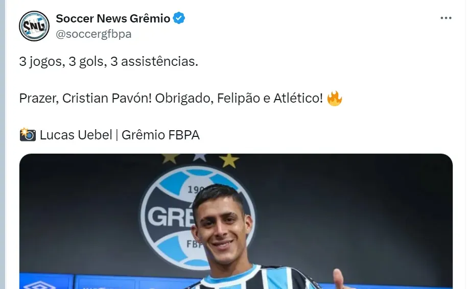 “3 jogos, 3 gols, 3 assistências. Prazer, Cristian Pavón! Obrigado, Felipão e Atlético!”, disse um perfil gremista no X (antigo Twitter) sobre o atacante, que chegou ao Imortal recentemente.