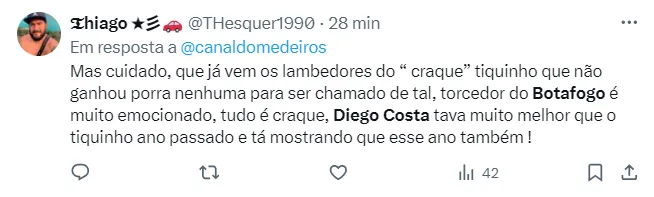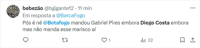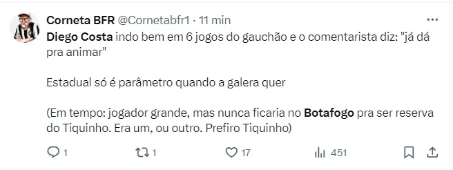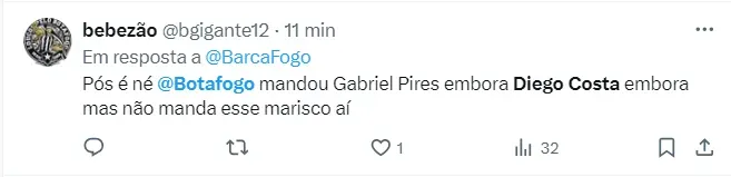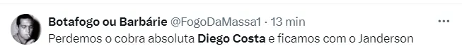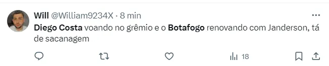 “Diego Costa voando no Grêmio e o Botafogo renovando com Janderson, tá de sacanagem”, comentou outro torcedor do Fogão. Confira abaixo mais comentários que pipocaram nas redes sociais.