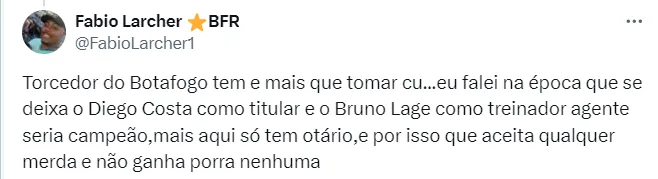 “Eu falei na época que se deixar o Diego Costa como titular e o Bruno Lage como treinador seríamos campeões”, disse um dos torcedores se manifestando na Web.
