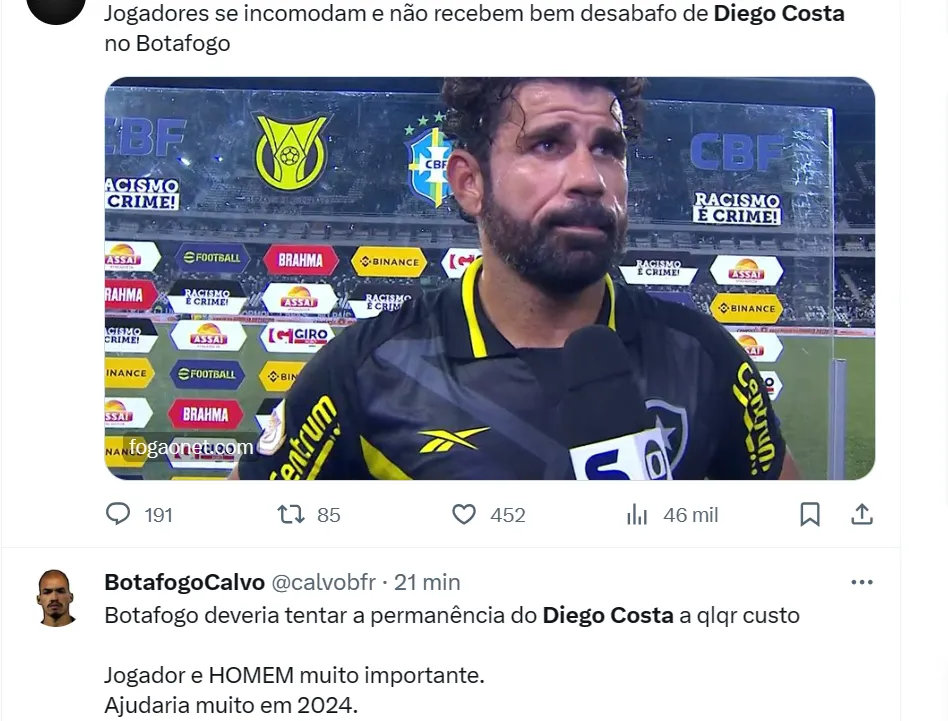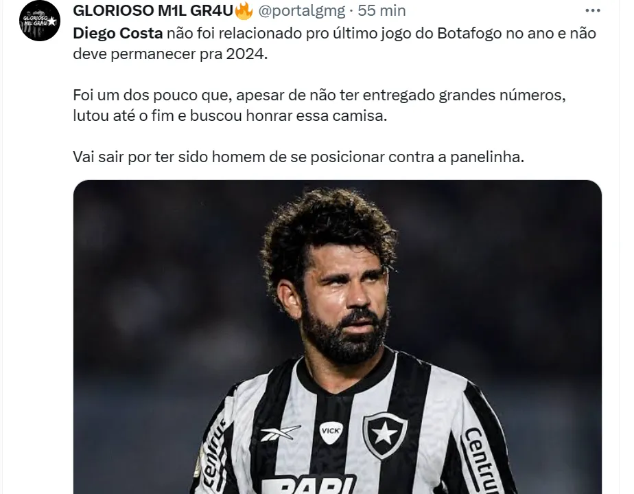 Nossa reportagem apurou que dificilmente Diego permanecerá em 2024. O jogador marcou três gols em 15 partidas pelo Fogão no Brasileiro. O custo-beneficio para um reserva e a elevada idade – 37 anos – pesam contra.