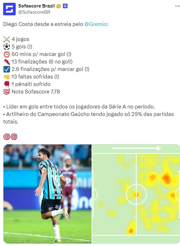 No total, em sua passagem pelo Galo, somou cinco gols em 19 partidas. Ou seja, se Diego Costa anotar mais um tento pelo Grêmio, o centroavante tem o seu melhor desempenho desde o seu retorno ao Brasil.