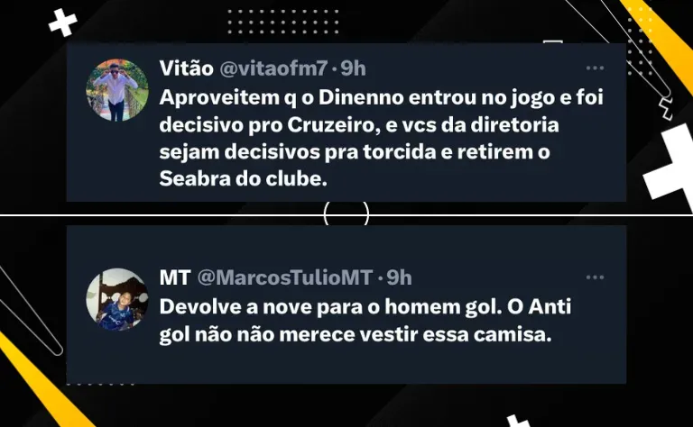 O autor dos dois gols do Cruzeiro foi Dinenno, que entrou no segundo tempo e empatou a partida. A torcida do Cabuloso tem pedido na web o jogador como titular da equipe de Seabra.
