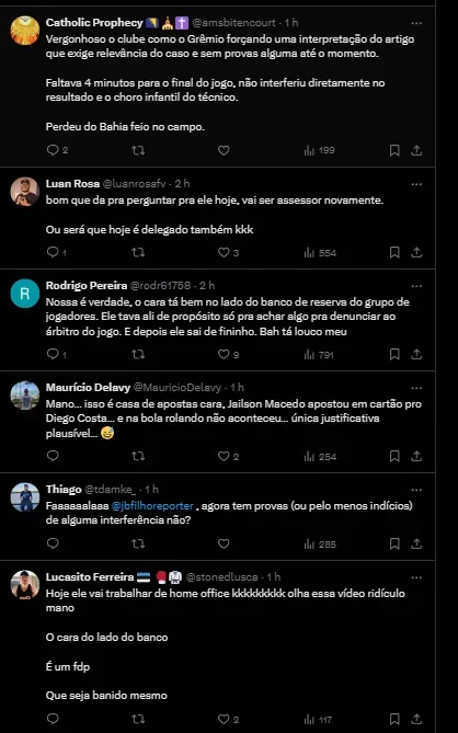 Uma pessoa que é presidente de arbitragem da federação baiana ao lado do 4º árbitro. Ele que apontou e mandou expulsar o Diego. Onde ele nem deveria estar”, completou Renato Gaúcho.