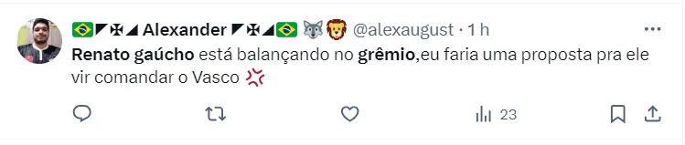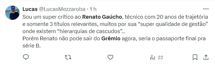 Mas, o que surpreende, é que mesmo diante do desempenho abaixo da equipe, a torcida acredita que a saída de Renato Gaúcho do comando pode agravar ainda mais a situação. Algo que a diretoria também concorda.