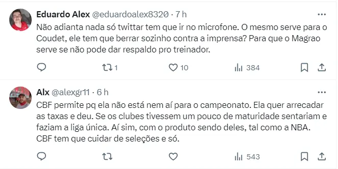 “Não sei como a CBF permite isso com seu principal produto @Brasileirão. Inversões de faltas e cartões errados. Só para citar alguns detalhes da partida de ontem. O primeiro tempo chegou a ser assustador. Pior ainda se analisarmos o histórico do ano do árbitro”, escreveu.