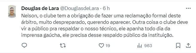 Anteriormente, em outra publicação, Nelson havia repostado uma publicação com o histórico do árbitro em um site que computa estatísticas, e fez uma ponderação no post.