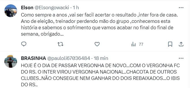 Mais do que isso, os dois últimos resultados ruins tiraram parte da esperança que o torcedor tinha de que o Internacional pudesse brigar pela classificação na Libertadores.