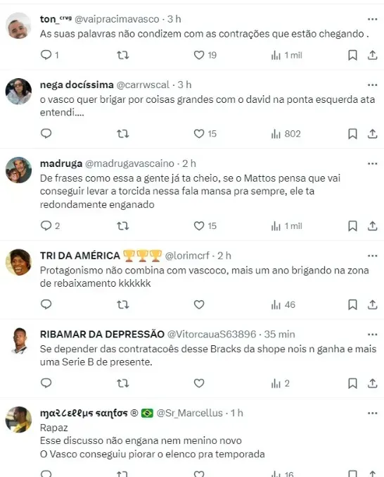 “O torcedor quer saber, sim, de contratações, mas quer saber se o Vasco está organizado, se o Vasco está buscando os seus processos, de gestão, se o Vasco está pagando as suas contas, se o Vasco está comprando jogador, como compramos recentemente de maneira organizada. Esse é o princípio básico para o Vasco conseguir vitórias e conquistar títulos“, continuou