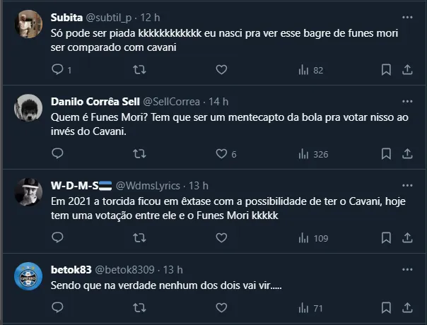 Vale frisar que, Cavani está com 36 anos e o Imortal pode utilizar o trunfo da Copa Libertadores para tirá-lo do Boca. Já Funes Mori está com 32 anos e, em tese, chegaria para ficar mais tempo, mesmo com grife menor.